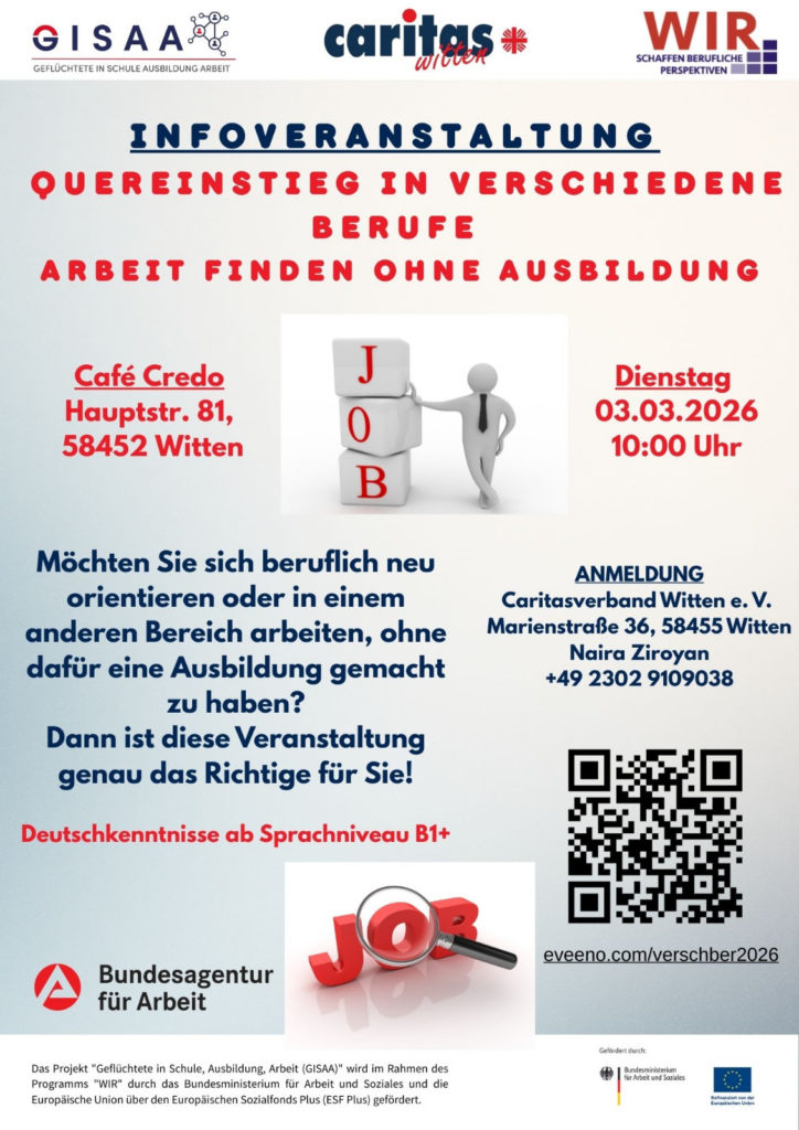 Der Caritasverband Witten e. V. unterstützt Teilnehmende bei der Suche nach passenden Stellenangeboten sowie im gesamten Bewerbungsprozess und nach erfolgreicher Vermittlung – in Einzelberatungen und im Rahmen von Workshops wie Bewerbungs-Camps. Zudem unterstützen wir junge Menschen der internationalen Förderklasse am Wittener Berufskolleg bei der Praktiumssuche und Bewerbungserstellung.