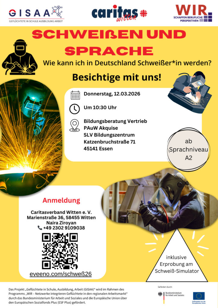 Das Projekt „Geflüchtete in Schule, Ausbildung, Arbeit (GISAA)“ wird im Rahmen des Programms „WIR – Netzwerke integrieren Geflüchtete in den regionalen Arbeitsmarkt“ durch das Bundesministerium für Arbeit und Soziales und die Europäische Union über den Europäischen Sozialfonds Plus (ESF Plus) gefördert.